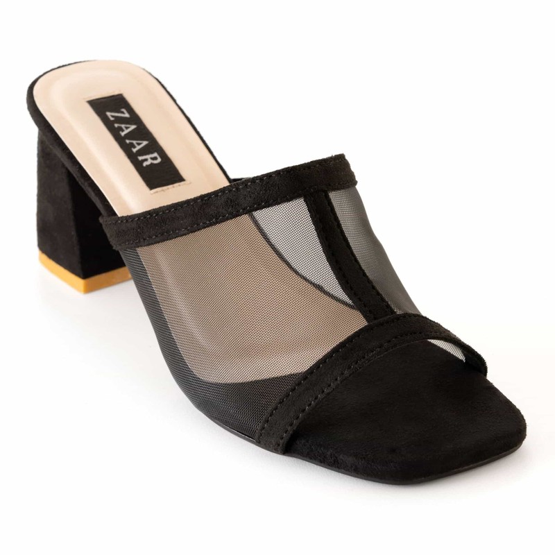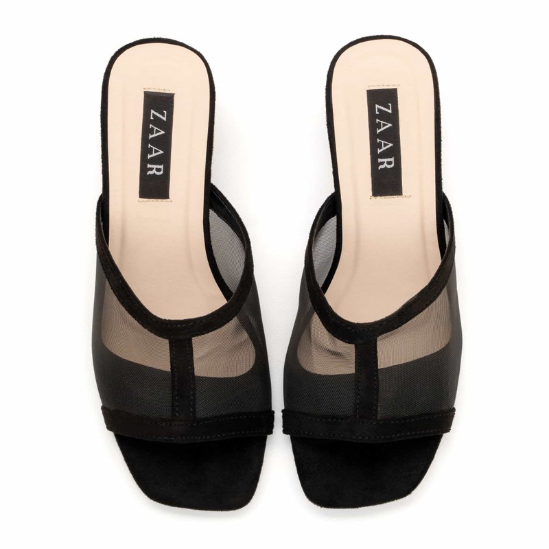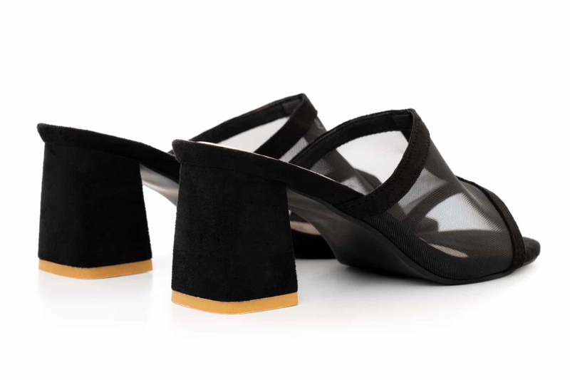 Fishnet mule heels bring updates. Aerie is designed in a suede palette with smooth edges, nude padded bed with two an a half inch heel. The open-toe mule is visible through net, has elastic structure and is the new black.